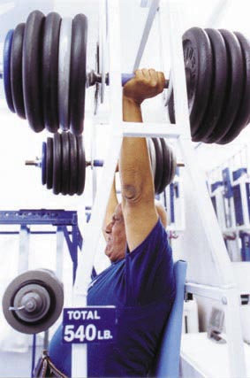 Шри Чинмой приподнимает над головой две гантели по 270 фунтов каждая (всего 540 фунтов) из положения сидя со специальных упоров, расположенных на уровне плеч.
