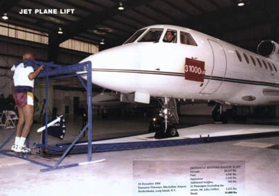 Шри Чинмой приподнимает реактивный самолет с помощью икроножных мышц на специальной платформе, которая отрывается от земли рычагом, приведенным к плечам. Общий вес поднятия составляет 31000 фунтов.