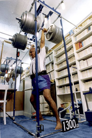 Шри Чинмой приподнимает над головой две гантели по 650 фунтов каждая (всего 1300 фунтов) из положения стоя со специальных упоров, расположенных на уровне плеч.