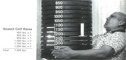 Шри Чинмой приподнимает 1200 фунтов на модифицированном тренажере для поднятия тяжестей икроножными мышцами из положения сидя.