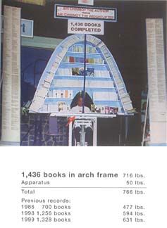 Общий вес книг, выложенных в форме арки, и модифицированного тренажера для поднятия тяжестей икроножными мышцами из положения сидя составляет 766 фунтов.