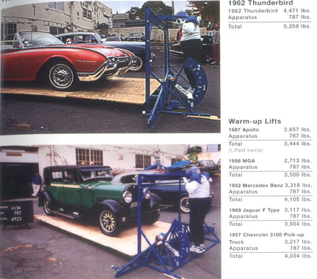 Шри Чинмой приподнимает автомобили на модифицированном тренажере для поднятия тяжестей икроножными мышцами из положения стоя.