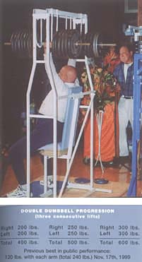 Шри Чинмой приподнимает две гантели по 300 фунтов каждая (всего 600 фунтов) из положения лежа на скамье со специальных упоров, расположенных над головой.